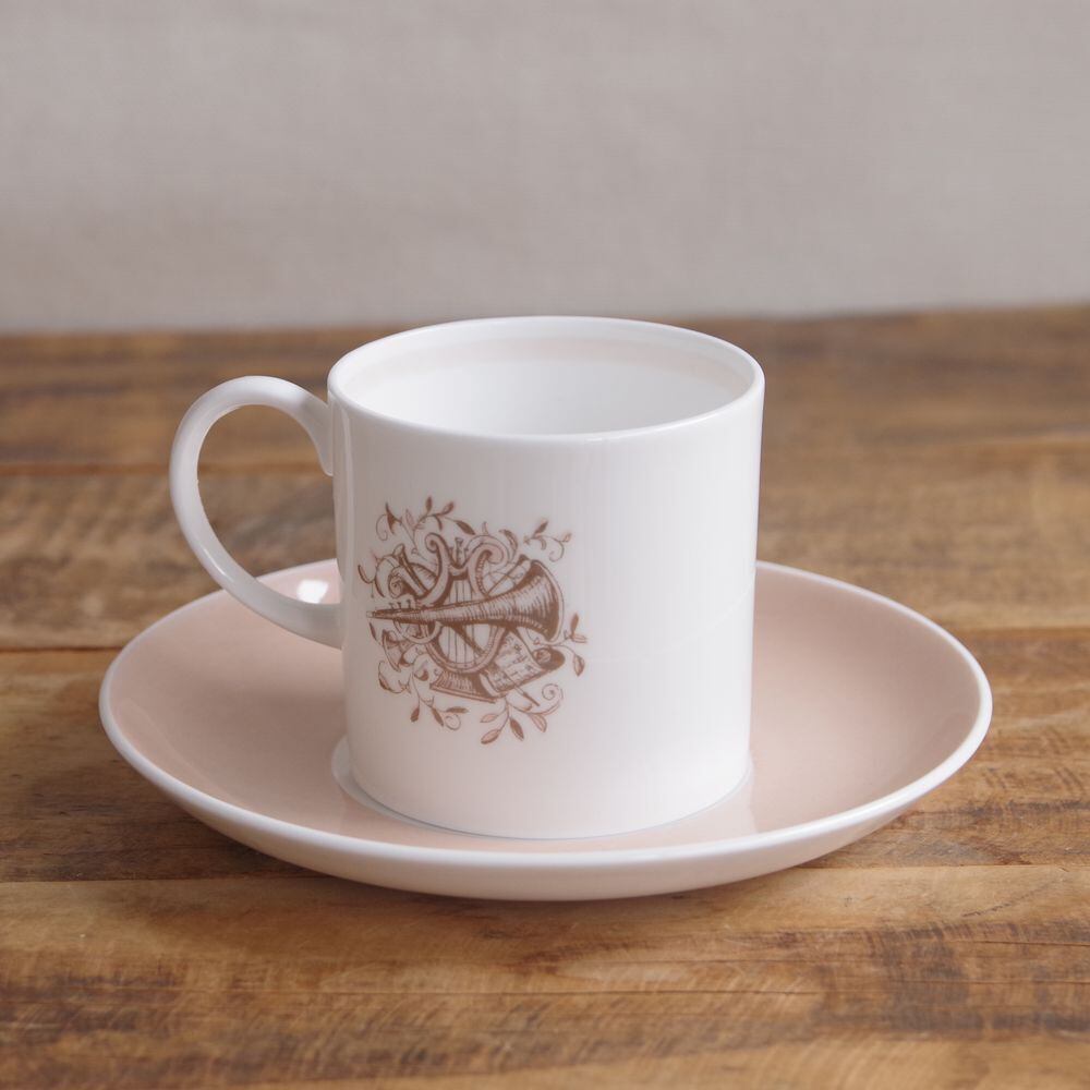 スージークーパー ミュージカルインスツルメンツ 楽器モチーフ コーヒーカップ ソーサー Susie Cooper Musical Instruments #241018-3 アンティーク ヴィンテージ 食器 陶器 レトロ バイオリン ホルン ラッパ ピンクベージュ