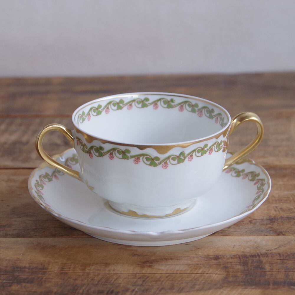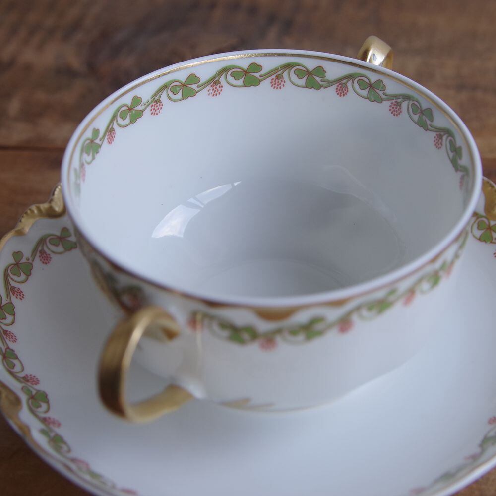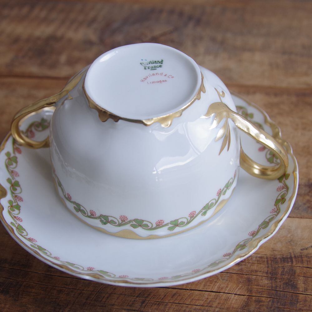 フランス アンティーク 食器 陶器 リモージュ アビランド クローバー柄 Clover Leaf スープカップ ソーサー 持ち手付き スープボウル #241025-2 Limoges Haviland France ゴージャス ゴールド