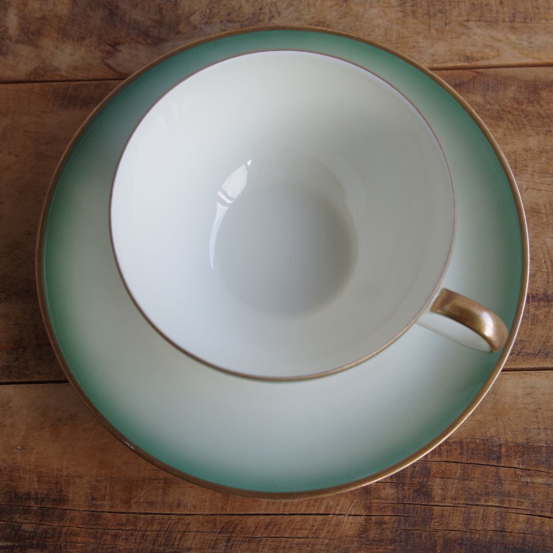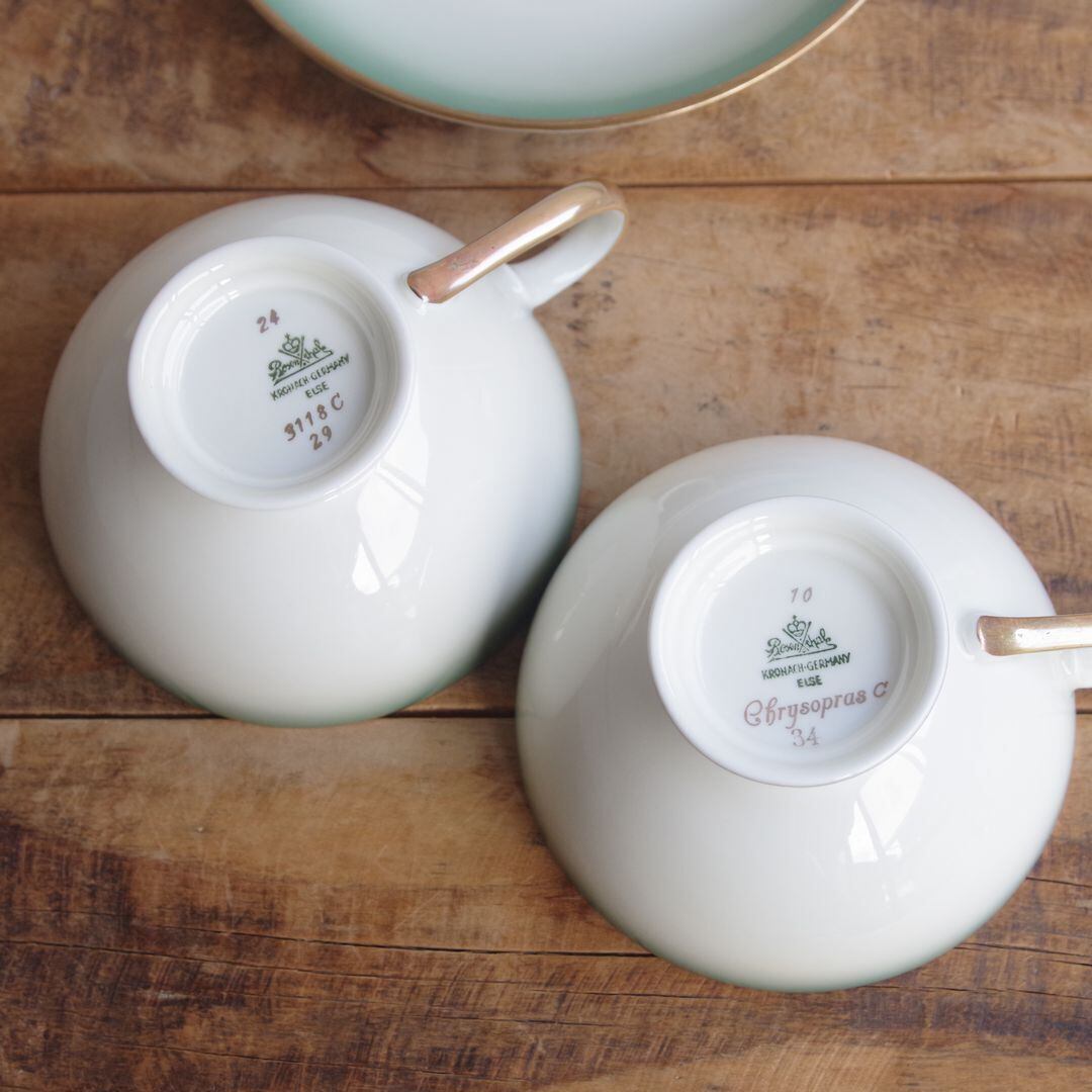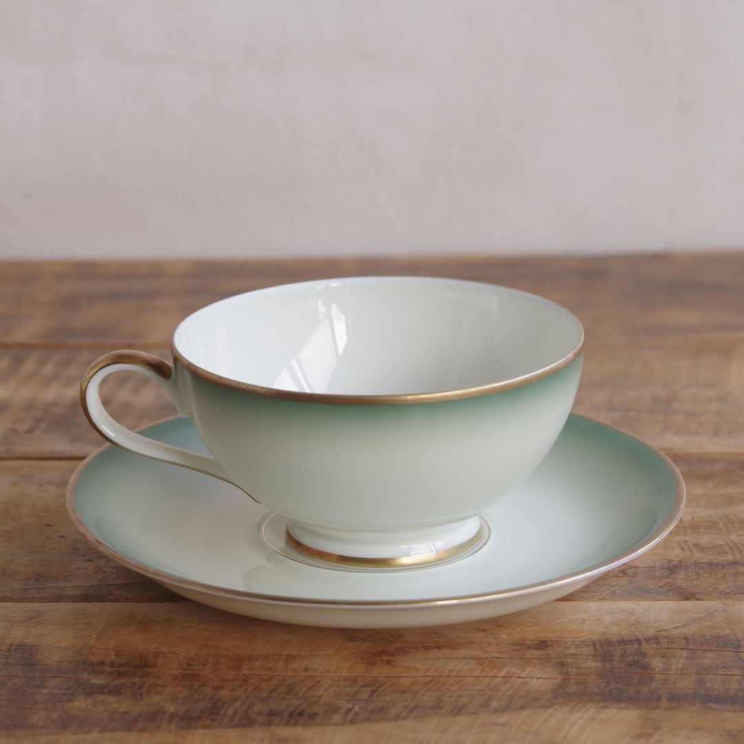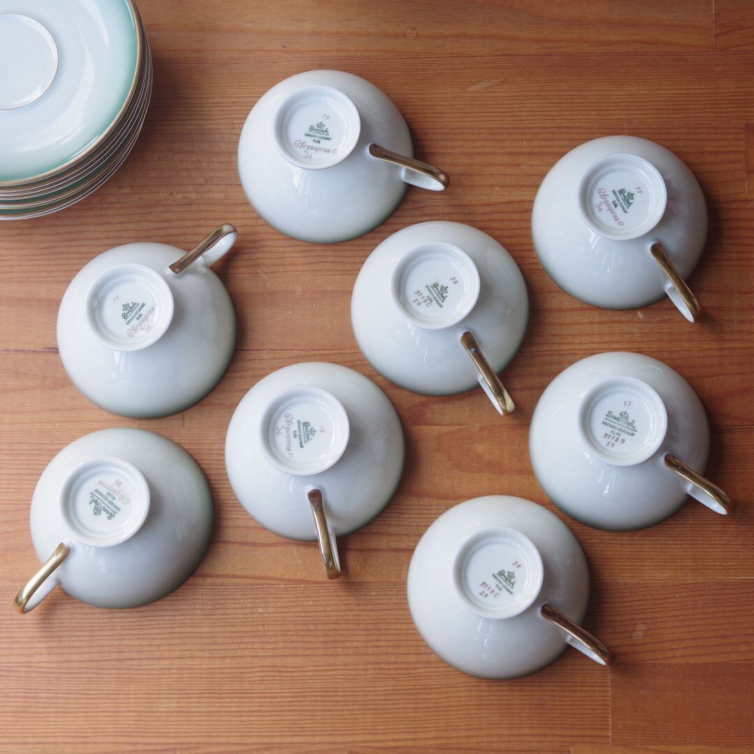 ローゼンタール アイボリー グリーン ゴールド ふちどり ティーカップ ソーサー ドイツ製 アンティーク食器 ヴィンテージ 陶器 #241120~1~8 昭和レトロ 象牙色 グラデーション 脚付き コーヒーカップ カップ&ソーサー デュオ Rosenthal Else