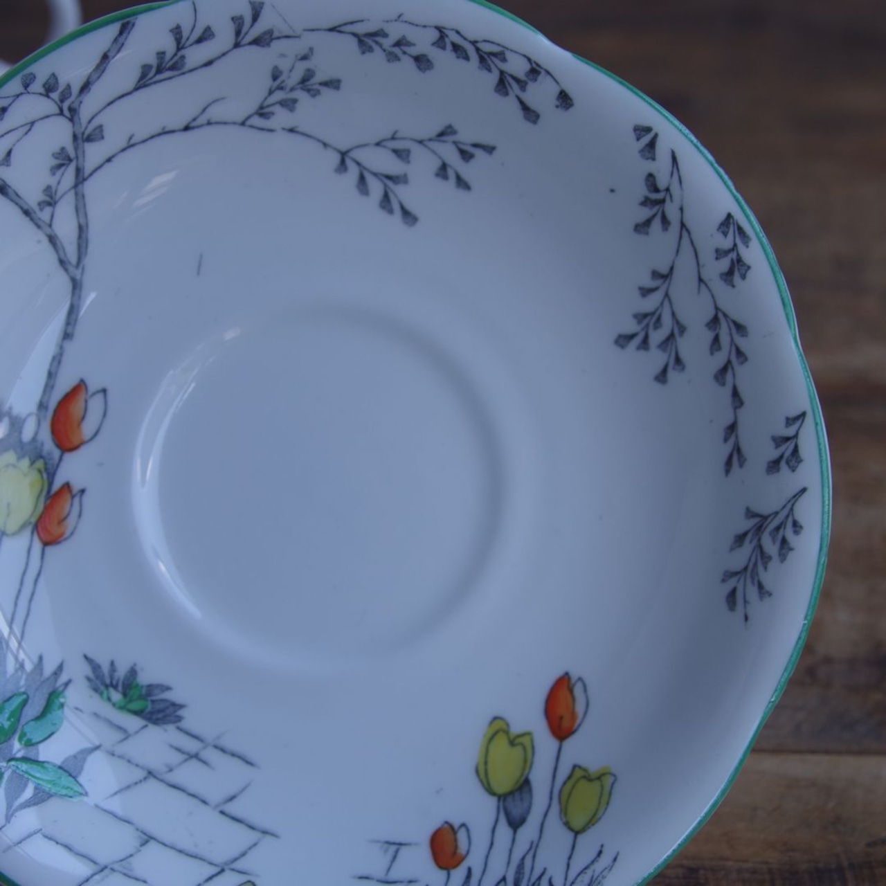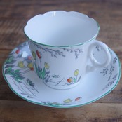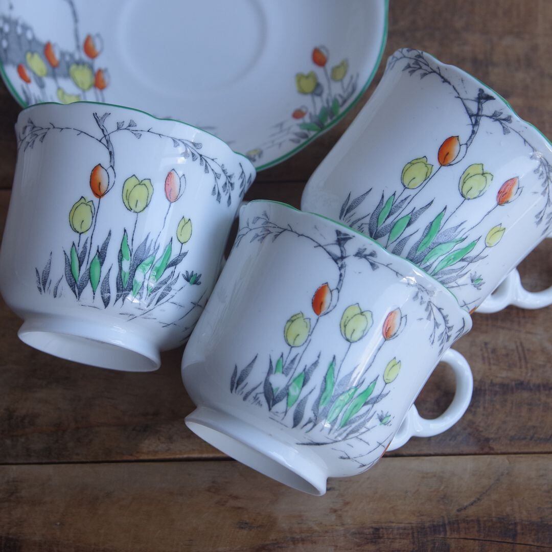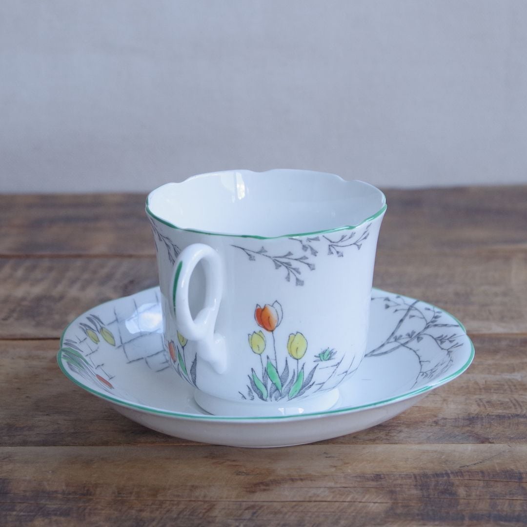 ヒースコート チューリップ 花柄 コーヒーカップ ソーサー Heathcote カップ&ソーサー ティーカップ デュオ #241219-1~4 イギリス アンティーク 食器 陶器 レトロ ヴィンテージ Best Bone Made in England グリーン