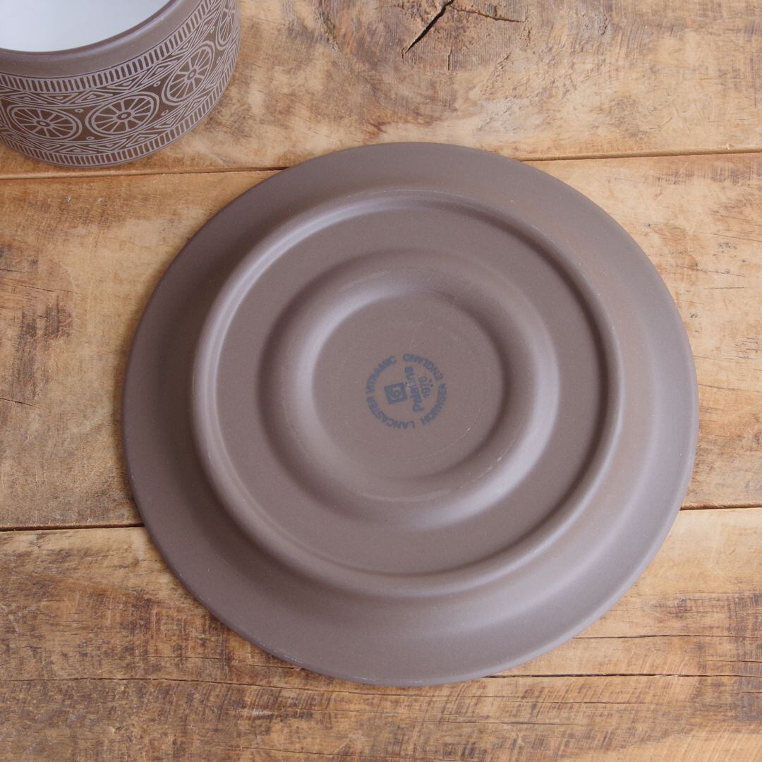 ソーサーは中央部分に白く光沢のある釉薬がかかり、リムには放射線状に縞模様が入っています。