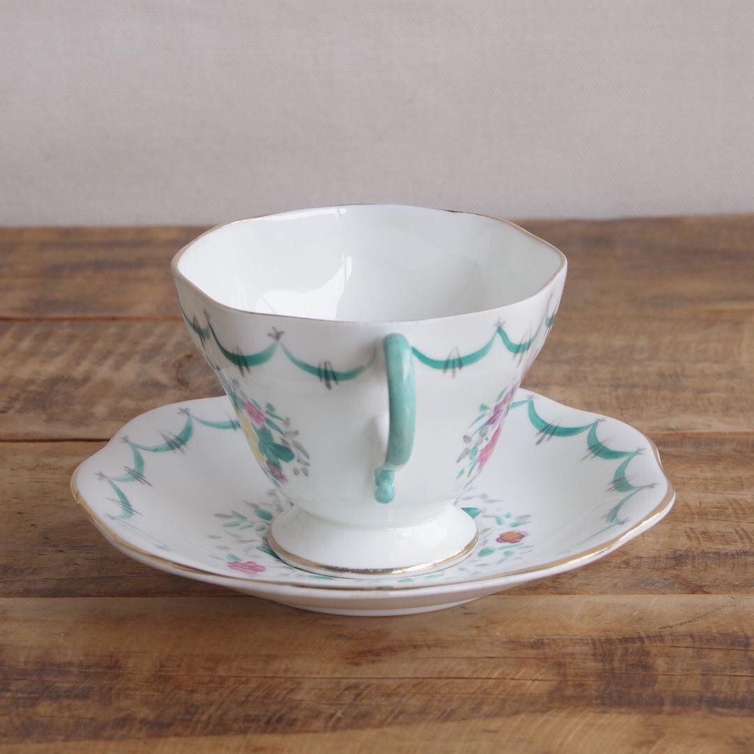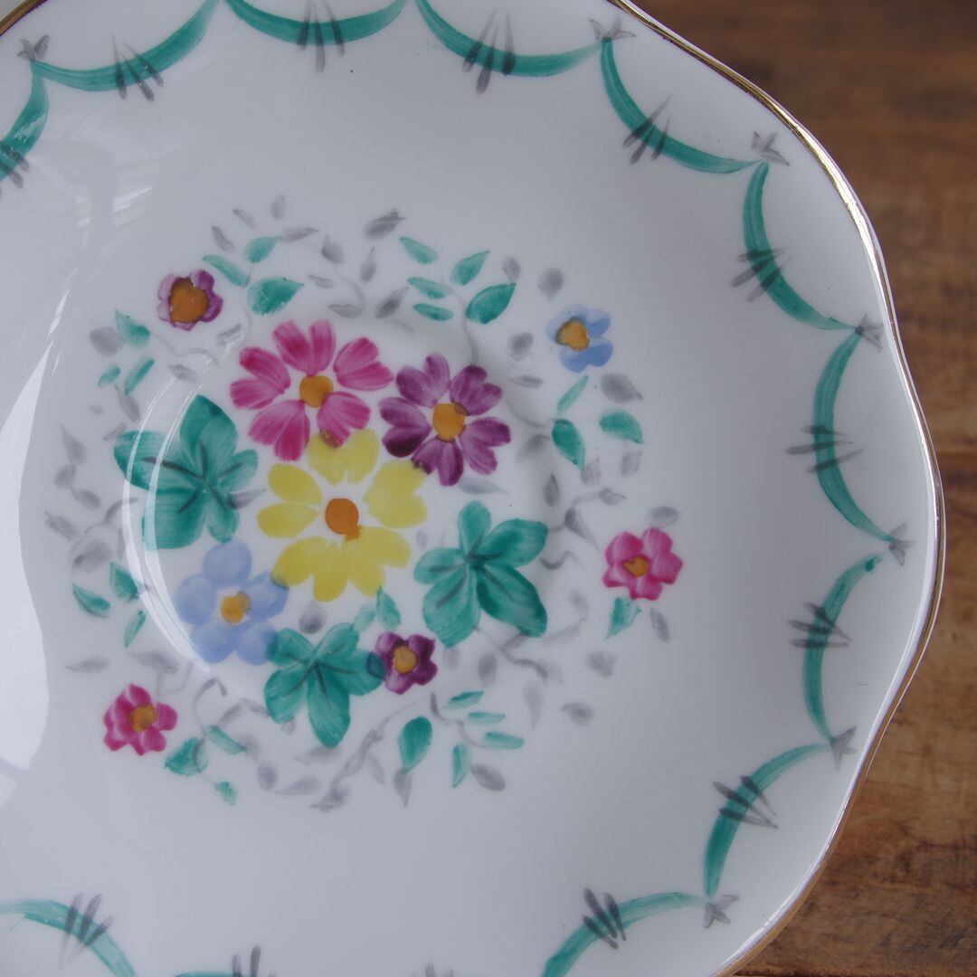 Foley フォーリー 手描き 花柄 コーヒーカップ&ソーサー ティーカップ イギリス アンティーク食器 ヴィンテージ #250221-2 レトロ 英国 雑貨 陶磁器 カラフル グリーン デュオ CS