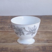 小さな脚のついた器の側面に、グレーで無花果の葉や実をつけた枝が描かれています。