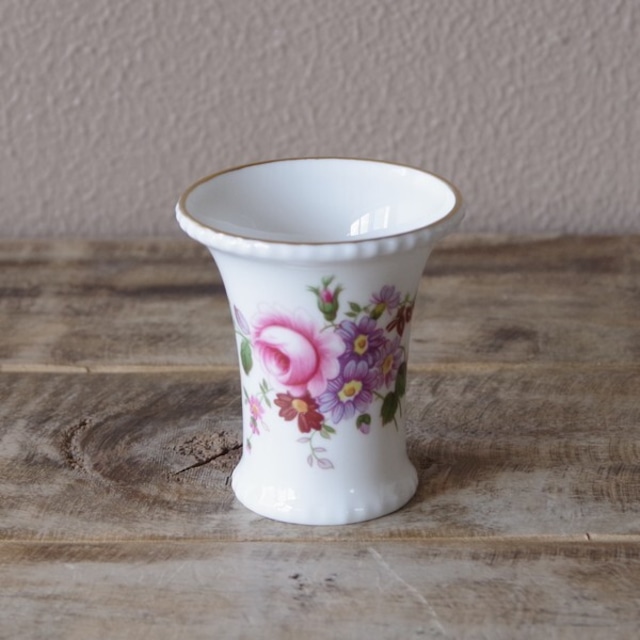-     ロイヤルクラウンダービー ポウジーズ ピンク 花柄 ショットグラス Royal Crown Derby Posies #201112-21 イギリス ヴィンテージ 陶器 デイジー 薔薇 レトロ シャビー ¥2,350 SOLD OUT イギリスの陶磁器メーカー Royal Crown Derby の小さなグラスです。 花瓶のような形ですが、かなり小さいので、ショットグラスではないかと思われます。 Posies というシリーズのものです。 華奢な陶磁器製の小さなトレイです。 薔薇やデイジーなどのブーケがモチーフとなった華やかなデザインです。 ゴールドのふちどりが入っています。 プレゼントにもオススメです。 1982年代のものと思われます。 状態に関して、特に目立つチップやヒビはありません。 わずかな擦り傷はあるかと思いますが、ヴィンテージ品としてはとてもきれいな状態です。 製品本来の品質として、ごく小さな黒点や色汚れ、絵柄の乱れなどがある場合があります。 詳細は写真にてご確認ください。 --- ■サイズ: 高さ約 6.4cm 口径約 6cm ※ 写真に写りこんだデコレーション等はお届け内容に含まれません。 ◆ ロイヤルクラウンダービー 商品一覧 https://flohmarkt.thebase.in/search?q=Derby
