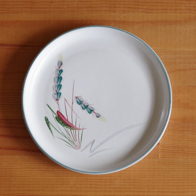 イギリスの陶磁器メーカー DENBY(デンビー)のデザートプレートです。 Green wheatという名前のモデルのものです。 縁が丸く反りあがったお皿で、さらっとしたマットな質感です。 麦の穂をモチーフにした手描きの絵柄が入っており、 ブルーグリーンのふちどりが入っています。 手描きの絵柄がレトロでかわいいデザインです。 1950~70年代ごろのものです。 状態に関して、特に目立つチップやヒビはありません。 擦り傷も特に目につかず、 ヴィンテージ品としてはとてもきれいな状態です。 製品本来の品質として、ちょっとした色むら、色汚れ、 黒点、不整形等はある場合があります。 詳細は写真にてご確認ください。 こちらの商品は複数在庫がございますが、 状態に特に差がございませんので、一商品として販売しております。 写真に写る3枚のうちの1枚をお送りいたします。 ご了承ください。 --- ■プレート:直径約 17.2cm ※ 写真に写りこんだデコレーション等はお届け内容に含まれません。 ◆ デンビー 商品一覧 https://flohmarkt.thebase.in/search?q=DENBY