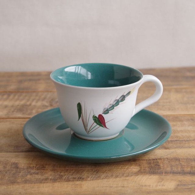 イギリスの陶磁器メーカー DENBY(デンビー)のカップ&ソーサーです。 Green wheatというモデルです。 カップの外側のみ、白いマットな釉薬がかけられています。 それ以外(カップ内側、ソーサー)は、ツヤのある深いグリーン色の釉薬がかけられています。 カップ側面に、麦の穂をモチーフにした手描きの絵柄が入っています。 色合いに落ち着きがあり、レトロモダンな雰囲気のあるカップです。 1950〜70年代ごろのものです。 状態に関して、特に目立つチップやヒビはありません。 ソーサー中央付近にわずかな擦り傷はありますが、 全体として傷は少なく、ツヤがあり、 ヴィンテージ品としてはきれいな状態です。 製品本来の品質として、ちょっとした色むら、色汚れ、 黒点、不整形等はある場合があります。 詳細は写真にてご確認ください。 --- ■カップ:高さ約 6.4cm 口径約 9.6cm ■ソーサー:直径約 15.4cm ※ 写真に写りこんだデコレーション等はお届け内容に含まれません。 ◆ DENBY 商品一覧 https://flohmarkt.thebase.in/categories/247448