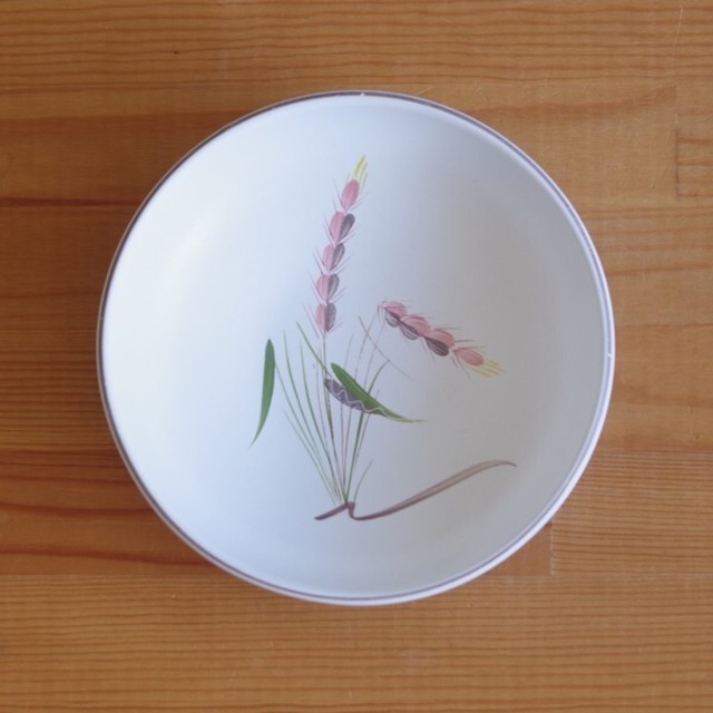 イギリスの陶磁器メーカー DENBY(デンビー) のボウルです。 Green Wheat というシリーズのもので、器の内側の底面に ピンクの穂をつけた麦のような植物が描かれています。 さらっとしたマットな質感で、手描きの麦の絵柄が レトロな雰囲気を出しています。 色合いがかわいらしく、ほっこりとした気分にさせてくれるデザインです。 1960〜80年代ごろのものと思われます。 状態に関して、特に目立つチップやヒビはありません。 ふちの部分に何か所か小さなぶつけ痕があります。 底面に少し細かな擦り傷やわずかな色剥げがあるように思われますが、 もともとがマットな質感なので、擦り傷はそれほど気になりません。 ヴィンテージ品としてはきれいな状態です。 製品そのものの品質として、多少の色むら、色汚れ、釉薬むら、 気泡痕、黒点等がある場合があります。 詳細は写真にてご確認ください。 --- ■サイズ: 高さ約 5.1cm 直径約 16.9cm ※ 写真に写りこんだデコレーション等はお届け内容に含まれません。 ◆ デンビー 商品一覧 https://flohmarkt.thebase.in/search?q=DENBY
