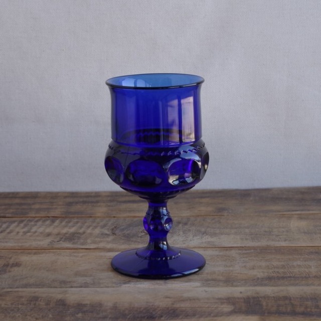 アメリカのガラスメーカー Tiffin のゴブレットです。 Kings Crown というシリーズのものです。 深みのある美しいブルーのガラス製です。 器の下部にはコインほどの大きさのへこみがついており、 持ちやすくなっています。 ワイングラスのような形をしていますが、 薄くはなく、しっかりした重量感のある作りで、 存在感のあるデザインです。 1940~60年代ごろのものです。 状態に関して、特に目立つチップやヒビはありません。 全体として擦り傷もあまりなく、ヴィンテージ品としてはとてもきれいな状態です。 製品本来の品質として、ちょっとした不整形や気泡等はある場合があります。 また、プレスガラスですので、型の境目が筋状に見える場合があります。 詳細は、写真にてご確認ください。 こちらの商品は複数在庫がございますが、 状態に特に差がございませんので、 一商品として販売しております。 写真に写る6客のうちの1客をお送りいたします。 ご了承ください。 --- ■サイズ:高さ約 14.5cm 口径約 7.5cm ※ 写真に写りこんだデコレーション等はお届け内容に含まれません。 ◆ Tiffin 商品一覧 https://flohmarkt.thebase.in/search?q=Indiana