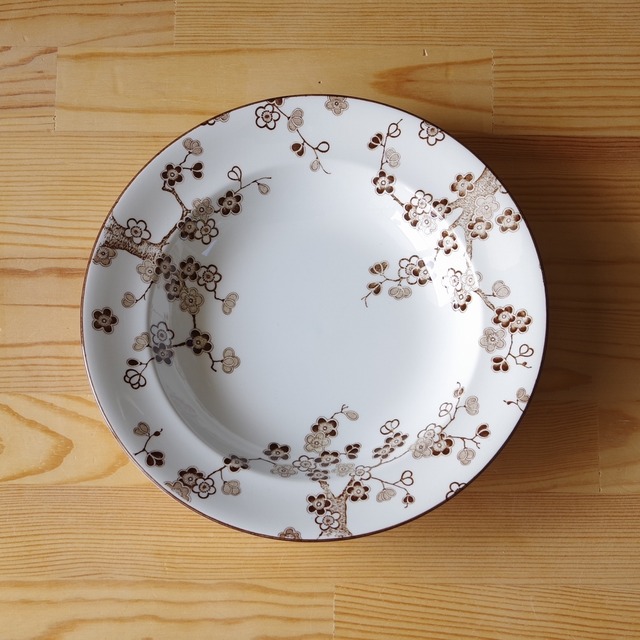 スウェーデンの陶磁器メーカー Rorstrand(ロールストランド)の深皿です。 Japonica というシリーズのもので、その名前の通り、和風のレトロな雰囲気があります。 版画のようなかすれたタッチのブラウンのラインで、梅の枝の絵柄が入っています。 ふちの部分にもブラウンのラインが入っています。 1960~70年代ごろのものです。 状態に関して、特に目立つチップやヒビはありません。 表面に若干の擦り傷はありますが、ヴィンテージ品としてはきれいな状態です。 製品そのものの品質として、多少の色汚れ(ダークブラウン)がある場合があります。 詳細は写真にてご確認ください。 --- ■サイズ:直径約 20.5cm 高さ約 3.5cm ※ 写真に写りこんだデコレーション等はお届け内容に含まれません。 ◆ Rorstrand 商品一覧 https://flohmarkt.thebase.in/categories/288973