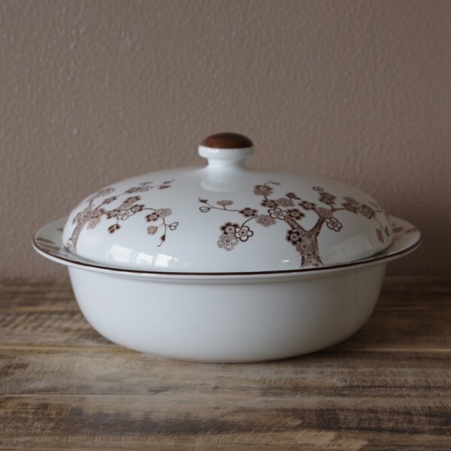 スウェーデンの陶磁器メーカー Rorstrand(ロールストランド)のチュリーン(蓋付きのボウル)です。 Japonica というシリーズのものです。 版画のようなかすれたタッチのブラウンのラインで、梅の枝の絵柄が入っています。 ふちの部分にもブラウンのラインが入っています。 名前の示す通り、和風の昭和レトロな雰囲気を感じられる器です。 蓋なしで器部分だけで使っても違和感のないデザインです。 1960~70年代ごろのものです。 状態に関して、特に目立つチップやヒビはありません。 傷も特に目につかず、ヴィンテージ品としては非常にきれいな状態です。 製品本来の品質として、ちょっとした色汚れ、にじみ、絵柄のかすれ、 小さな不整形等はある場合があります。 詳細は写真をご参照ください。 --- ■サイズ:直径約 24.3cm 高さ約 6.7cm(器のみ) 高さ約 15cm(蓋を含めて) ※ 写真に写りこんだデコレーション等はお届け内容に含まれません。 ◆ ロールストランド 商品一覧 https://flohmarkt.thebase.in/categories/288973