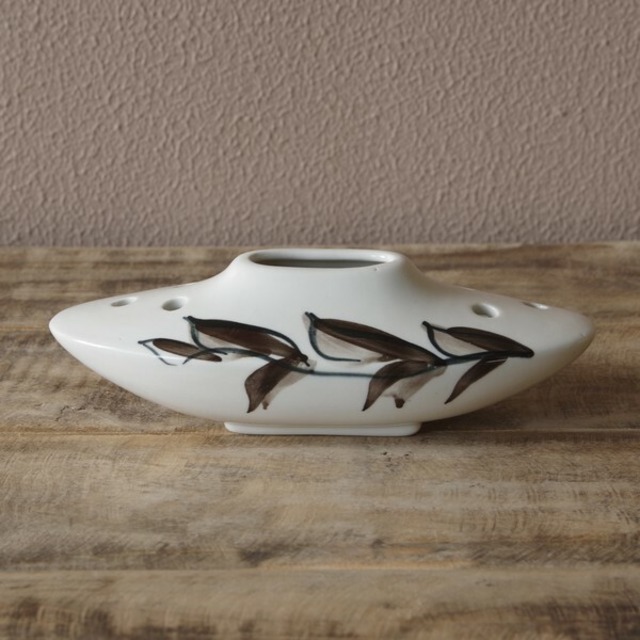 イギリスの陶磁器メーカー Jersey Pottery(ジャージーポタリー)の花瓶です。 ボートのような横長の個性的な形で、 側面には手描きで木の葉を付けた枝の絵柄が入っています。 上面には楕円の穴が開いており、その周囲にも小さな穴が開いています。 花瓶としては小さいものなので、小さな草花を生ける程度にしか使えませんが、 レトロな独特の雰囲気があり、存在感のある花瓶です。 1960~80年代ごろのものと思われます。 状態に関して、特に目立つチップやヒビはありません。 貫入も特にないように見えます。 わずかに擦り傷がある部分もありますが、ツヤがあり、ヴィンテージ品としてはきれいな状態です。 製品本来の品質として、ちょっとした色汚れや気泡などがある場合があります。 詳細は写真をご参照ください。 --- ■サイズ: 長さ約 17.5cm 高さ約 5.5cm ※ 写真に写りこんだデコレーション等はお届け内容に含まれません。 ◆ Jersey Pottery 商品一覧 https://flohmarkt.thebase.in/search?q=Jersey