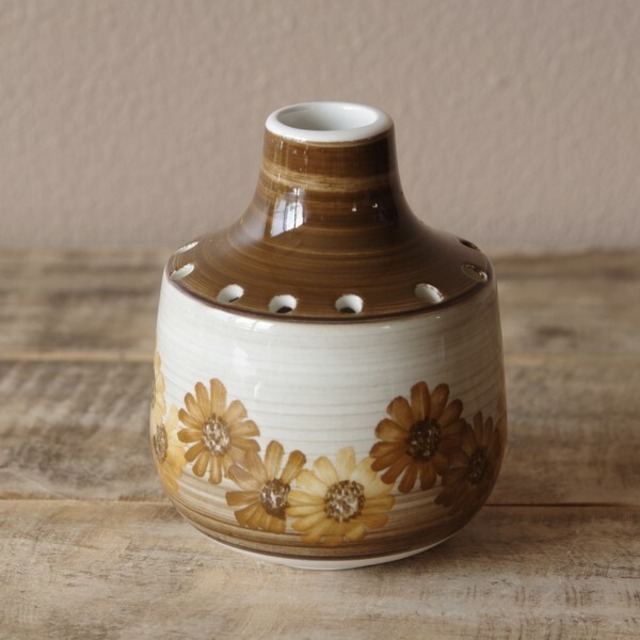 イギリスの陶器メーカー Jersey Potteryの小さな花瓶です。 平たい徳利のような壺型の丸い花瓶で、上部中央に口があり、その周りにいくつも小さな穴が開いています。 ブラウンのグラデーションで、花の絵柄が入っています。 花瓶として大きな花を活けられるような重量感はありませんが、レトロでかわいらしいデザインです。 デフューザーなどとして使われてもよいかと思います。 1950~70年代ごろのものと思われます。 状態に関して、特に目立つチップやヒビはありません。 若干のスレや擦り傷などはあるかと思いますが、全体として傷は少なく、つやがあり、ヴィンテージ品としてはとてもきれいな状態です。 製品本来の品質として、絵の具汚れや小さな凹凸、気泡痕や若干の色むらなどがある場合があります。 詳細は写真にてご確認ください。 --- ■サイズ:高さ約 7cm 直径約 10cm ※ 写真に写りこんだデコレーション等はお届け内容に含まれません。