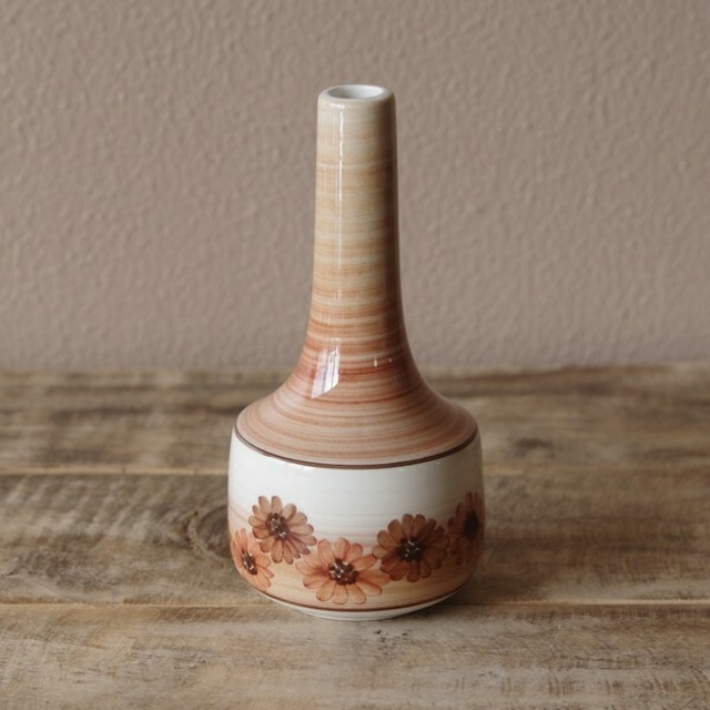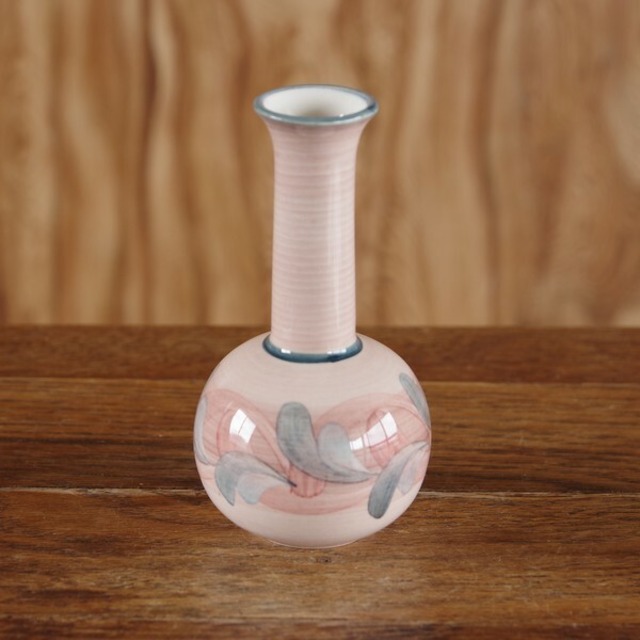 イギリスの陶磁器メーカー Jersey Pottery(ジャージーポタリー)の花瓶です。 丸いボディに長い首の付いたとても小さなかわいい花瓶です。 ピンクベージュの地に、グリーン色の葉のような模様が入っています。 水墨画のように筆全体を使って色が入れられており、 水彩画のように色の濃淡などが美しく出ています。 花瓶としては小さいものなので、小さな草花を生ける程度にしか使えませんが、 手描きの絵柄の風合いがかわいらしく、存在感のある花瓶です。 1960~80年代ごろのものと思われます。 状態に関して、特に目立つチップやヒビはありません。 すり傷も特に目立たず、ツヤがあり、ヴィンテージ品としてはとてもきれいな状態です。 詳細は写真をご参照ください。 --- ■サイズ: 高さ約 11cm 最大径約 6cm ※ 写真に写りこんだデコレーション等はお届け内容に含まれません。 ◆ ジャージーポタリー 商品一覧 https://flohmarkt.thebase.in/search?q=Jersey