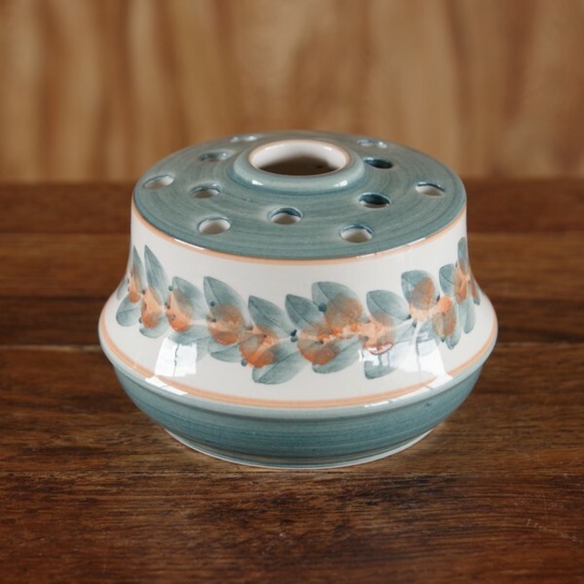 イギリスの陶器メーカー Jersey Potteryの花瓶です。 平たい円形の花瓶で、上部中央に大きな穴が開いており、 その周りにいくつも小さな穴が開いています。 側面には、グリーンやブラウンで、花びらのような模様が入っています。 レトロな雰囲気で、個性的な存在感のある花瓶です。 1950~70年代ごろのものと思われます。 状態に関して、特に目立つチップやヒビはありません。 全体的に貫入があります。 そのほか、若干のスレや擦り傷などはあるかと思いますが、全体として傷は少なく、つやがあり、ヴィンテージ品としてはとてもきれいな状態です。 製品本来の品質として、絵の具汚れや小さな凹凸、気泡痕や若干の色むらなどがある場合があります。 詳細は写真にてご確認ください。 --- ■サイズ:高さ約 7cm 直径約 13.5cm ※ 写真に写りこんだデコレーション等はお届け内容に含まれません。