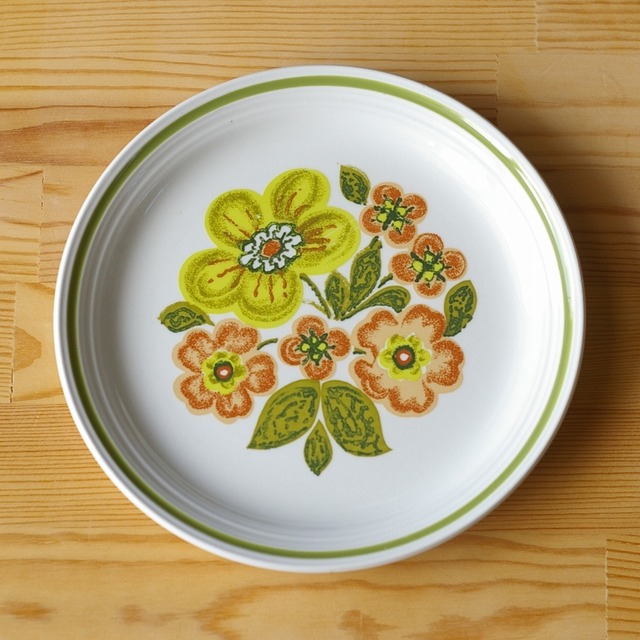イギリスの陶磁器メーカー Myott(ミヨット)のプレートです。 きみどりやオレンジ色のレトロな花の絵柄が入ったかわいらしいプレートです。 裏側のバックスタンプも花の形でかわいらしいです。 1950~70年代ごろのものと思われます。 状態に関して、特に目立つチップやヒビはありません。 表面の傷もあまりなく、ヴィンテージ品としてはとてもきれいな状態です。 写真にてご確認ください。 こちらの商品は、複数在庫がございますが、 状態に特に差がありませんので、1商品として販売しております。 そのため、写真とお届けする現物とではごく細かな点で差異がある場合があります。 ご了承ください。 --- ■サイズ:直径約 17.5cm ※ 写真に写りこんだデコレーション等はお届け内容に含まれません。 ◆ イギリス製ヴィンテージ食器 商品一覧 https://flohmarkt.thebase.in/search?q=%E3%82%A4%E3%82%AE%E3%83%AA%E3%82%B9%E8%A3%BD