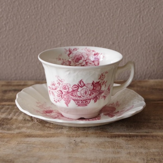 イギリス アンティーク 食器 陶器 ミヨット プリマス ピンク フルーツ柄 花柄 コーヒーカップ ソーサー #201005-3 Myott Sons.&Co. Plymouth ヴィンテージ バスケット