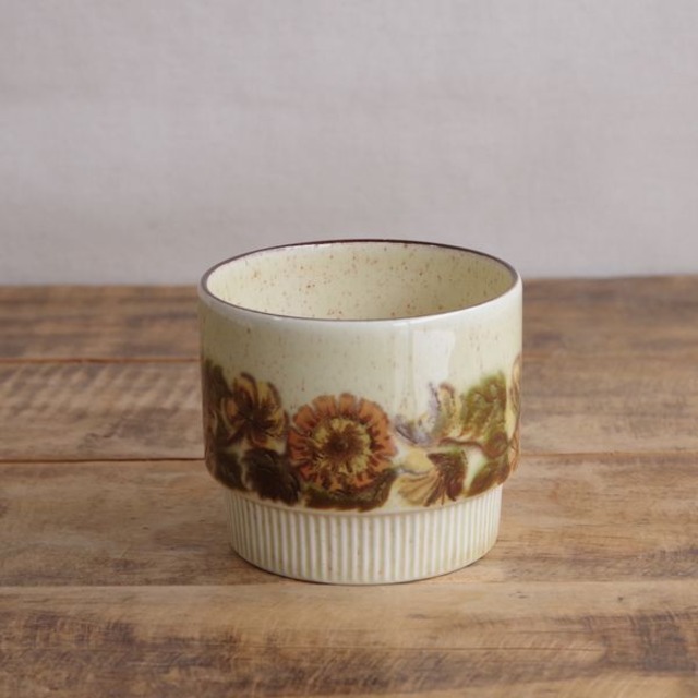 イギリスの陶器メーカー Poole のカップ&ソーサーです。 Thistlewood という名前のモデルで、 ベージュの地に、つぶつぶとブラウンの点が入っています。 あざみの花の絵柄が入ったレトロなデザインで、 カップの足元は少し細くなっており、スタッキング可能です。 カップの足元やソーサーのリム部分には、筋状のエンボスが入っています。 1970年代ごろのものです。 状態に関して、特に目立つチップやヒビはありません。 わずかな擦り傷はありますが、全体として傷は少なく、ツヤがあり、 ヴィンテージ品としてはとてもきれいな状態です。 詳細は写真にてご確認ください。 --- ■カップ:高さ約 7.9cm 口径約 7.3cm ■ソーサー: 直径約 14.1cm ※ 写真に写りこんだデコレーション等はお届け内容に含まれません。 ◆ Poole 商品一覧 https://flohmarkt.thebase.in/search?q=Poole