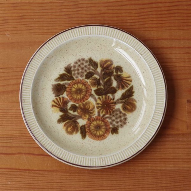 イギリスの陶器メーカー Poole のプレートです。 Thistlewood という名前のモデルで、 ベージュの地に、つぶつぶとブラウンの点が入っています。 中央に、ブラウンのあざみの花が手描きされています。 リム部分には、縞状にエンボスが入っています。 レトロでちょっと懐かしいような、温かみを感じるデザインです。 1970年代ごろのものです。 状態に関して、特に目立つチップやヒビはありません。 わずかな擦り傷はあるかと思いますが、全体として傷は少なく、ツヤがあり、 ヴィンテージ品としてはとてもきれいな状態です。 製造時からあるちょっとした色むらや絵柄の乱れなどはある場合があります。 詳細は写真にてご確認ください。 こちらの商品は、複数在庫がございますが、 状態に差がありませんので一商品として販売しております。 手描きの絵柄でもありますので、多少の個体差はあるかと思います。 写真に写る2枚のうちの1枚をお送りいたします。 ご了承ください。 --- ■サイズ: 直径約 17.8cm ※ 写真に写りこんだデコレーション等はお届け内容に含まれません。 ◆ Poole 商品一覧 https://flohmarkt.thebase.in/search?q=Poole