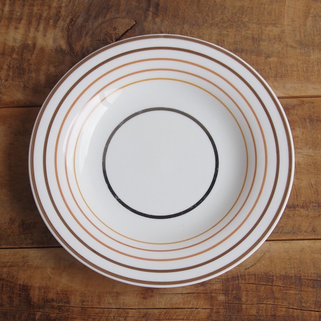 イギリスの陶磁器メーカー Wedgwood のデザートプレートです。 イエロー、赤、オレンジ、ブラウンのラインが同心円状に入っています。 いちばん内側には、シルバー(プラチナ)のラインが入っています。 シンプルすぎない、スタイリッシュなデザインです。 1950年前後のものと思われます。 【状態について】 特に目立つチップやヒビはありません。 中央のシルバーの輪の部分に、少し色剥げがあります。 わずかな擦り傷や色剥げはあるかと思いますが、全体として傷は少なく、つやがあり、ヴィンテージ品としてはきれいな状態です。 製品本来の品質として、ちょっとした絵の具汚れ、釉薬むら、黒点や不整形等はある場合があります 詳細は写真にてご確認ください。 こちらの商品は複数在庫にございますが、状態に大きな差がありませんので、一商品として販売しております。 写真に写る 3枚のうちの 1枚をお送りいたします。 ご了承ください。 --- ■サイズ: 直径約 17.4cm ※ 写真に写りこんだデコレーション等はお届け内容に含まれません。 ◆ ウェッジウッド 商品一覧 https://flohmarkt.thebase.in/search?q=Wedgwood